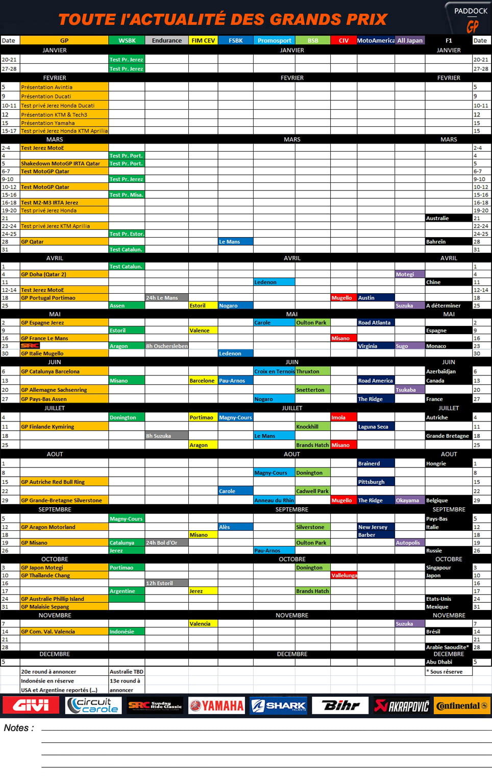 Calendrier complet 2021 à imprimer : MotoGP, WSBK, EWC, FIM CEV, FSBK, Promosport, CIV, BSB, MotoAmerica, All Japan et F1