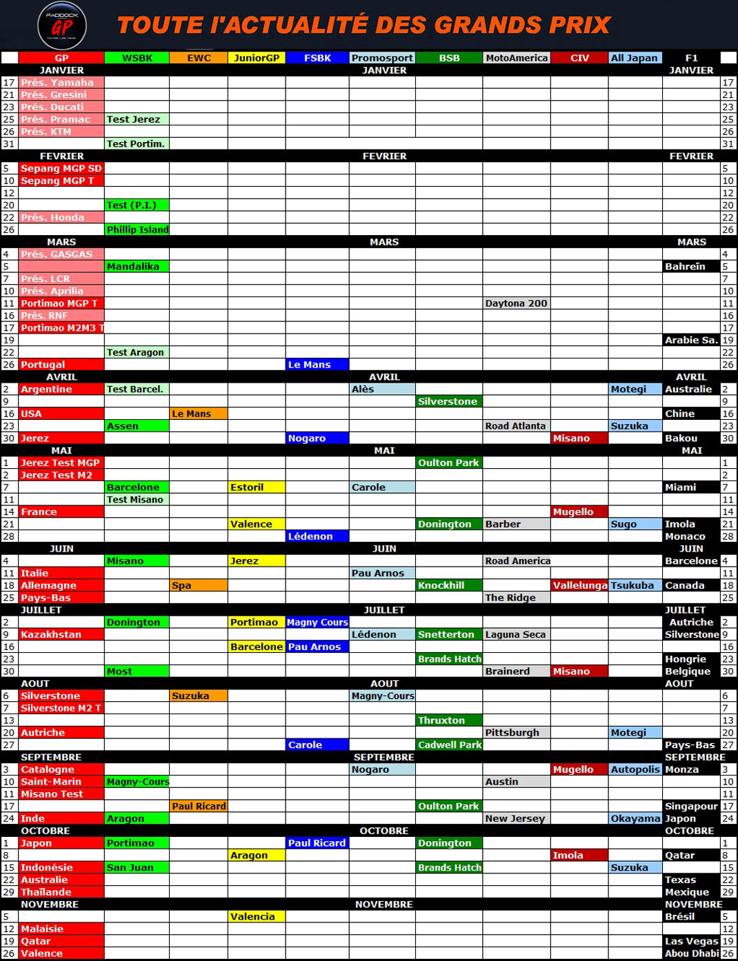 Les grandes dates du calendrier 2023 global MotoGP, WSBK, EWC, JuniorGP, FSBK, Promosport, BSB, CIV, MotoAmerica, All Japan et F1 sont maintenant figées, et nous avons complété ces dernières avec les dates disponibles de présentation des teams MotoGP et des essais Superbike.
