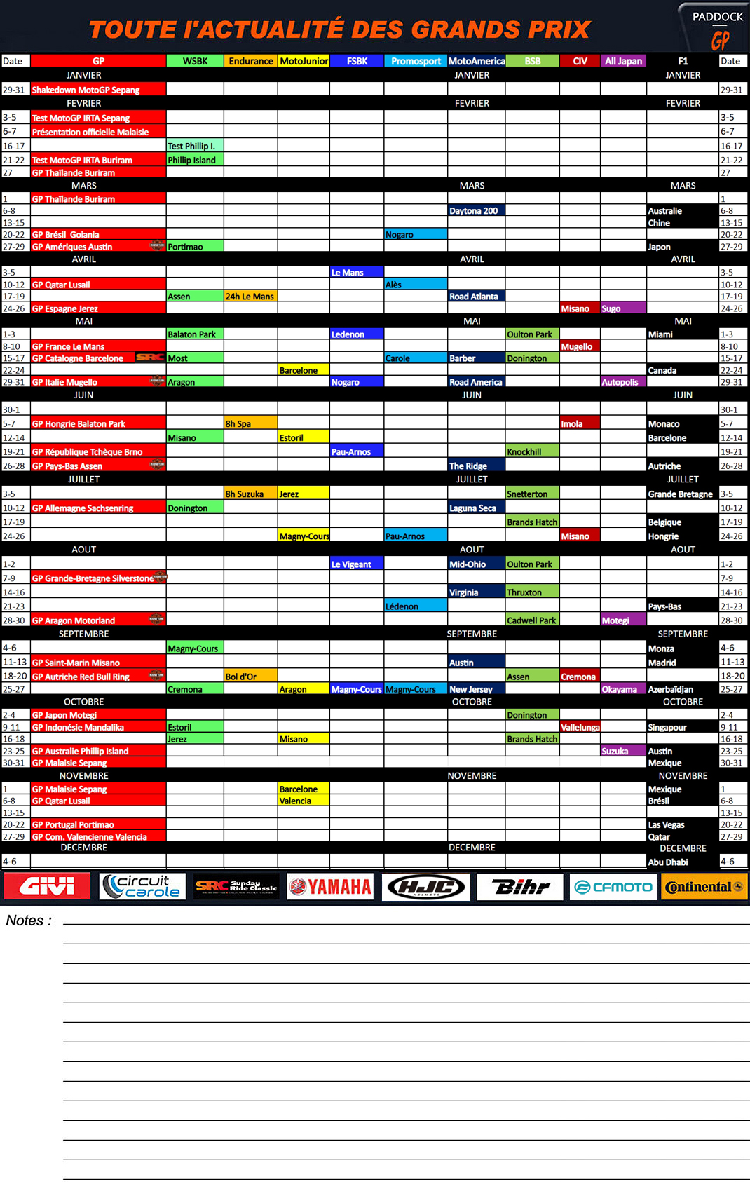 Calendrier 2026 à imprimer : MotoGP, Superbike, Endurance, MotoJunior, FSBK, Promosport, MotoAmerica, BSB, CIV, All Japan et F1 ! (V3)