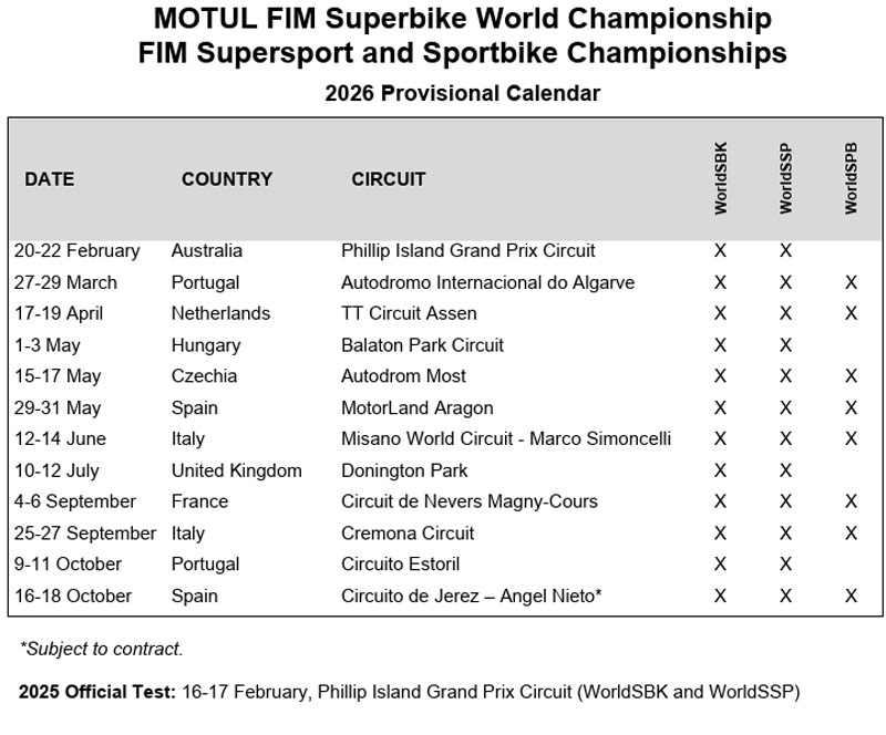 Comme chaque année, les pilotes du World Superbike lanceront les hostilités en Australie. Le circuit de Phillip Island, rapide et spectaculaire, donnera le ton de cette nouvelle saison 2026. Le clap de fin interviendra en octobre, à Jerez, l’un des bastions du motocyclisme espagnol, garantissant une météo clémente pour le final.