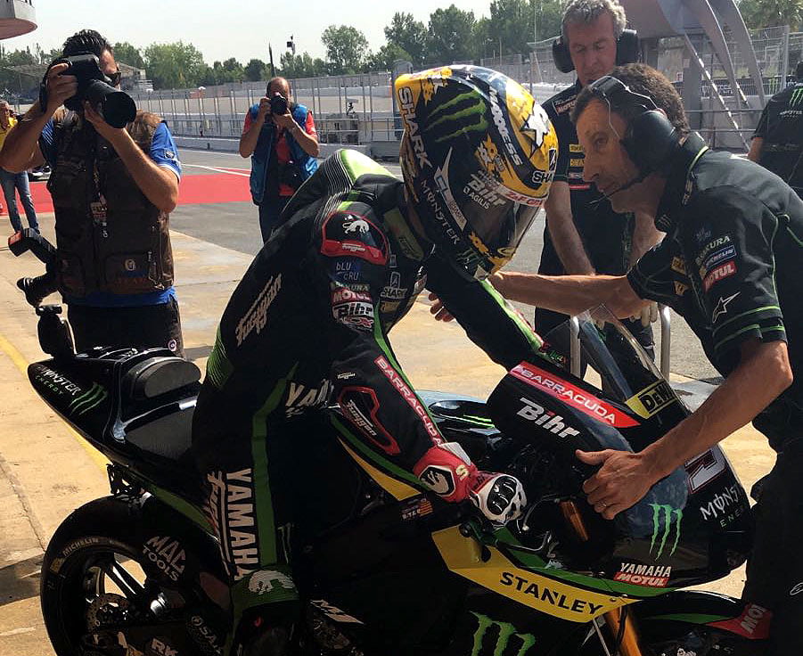Peu après, Johann Zarco est le premier pilote a passer les pneus slicks. Il inaugure également un casque jaune aux couleurs de Maxxess pour ce week-end.