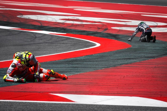 Et dire qu’il y a peu, le même Iannone jurait qu’il ferait bien équipe avec Por Fuera chez Ducati parce qu’il est convaincu d’avoir le même style de pilotage. On sait la suite. Mais à présent, il s’est attiré les foudres d’un Majorquin légitimement agacé par la tournure des événements : « heureusement, je n’ai pas été sérieusement touché à la clavicule et à la hanche » commence l’équipier d’un Rossi vainqueur pour la dixième fois en Catalogne.