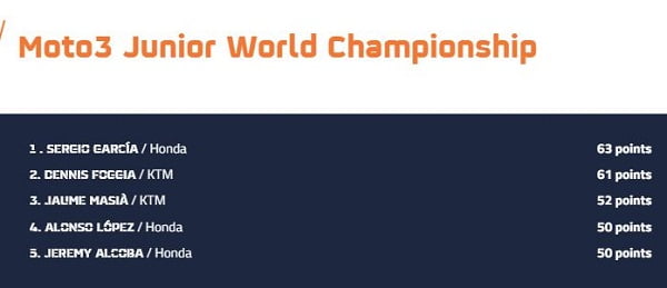 L’espagnol précède l’Italien de deux points. Ils devancent Jaume Masia, et le rapide Alonso Lopez, qui a remporté les deux seules course qu’il est parvenu à terminer. Jeremy Alcoba est également à la lutte pour le titre, avec actuellement seulement 13 points de retard sur le leader.