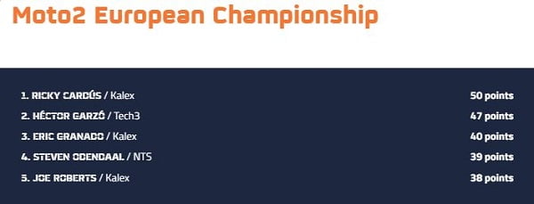 En Moto2, il n’y a eu que trois courses. Ricky Cardus, qui n’a pas participé à la première, a remporté les deux autres, ce qui lui vaut de mener le Championnat avec 50 points. Derrière sa Kalex, Hector Garzo (la surprise des qualifications du GP d’Allemagne avec le cinquième temps) place sa Mistral Tech 3 en deuxième position à trois points.