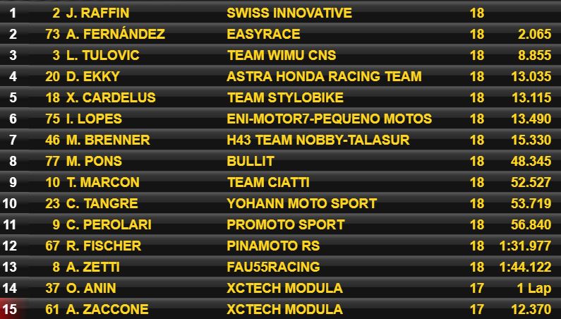 Jesko Raffin franchissait confortablement la ligne d’arrivée devant Augusto Fernandez. Lukas Tulovic réussissait à s’extraire du pelon des poursuivants pour amener sa Mistral sur la troisième marche du podium. Alessandro Zaccone tombait sans gravité dans le dernier tout alors qu’il était sixième. Cédric Tangre terminait dixième juste devant Corentin Perolari.