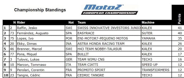 Classement provisoire du Championnat d’Europe Moto2 :