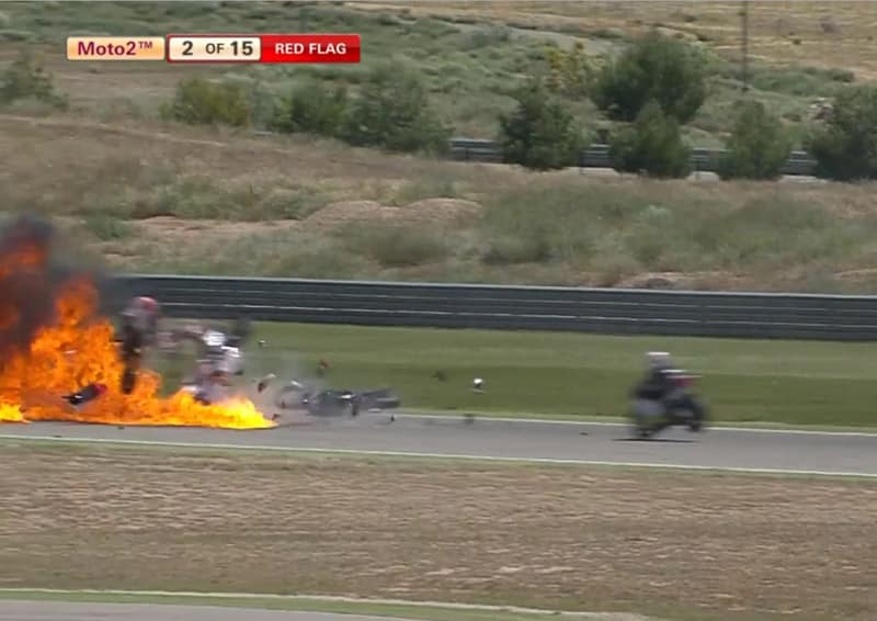 Une autre moto roule sur ledit réservoir et s’embrasse immédiatement, créant le chaos et entraînant de nombreux pilotes à terre dont certains restent au sol; des images que l’on n’aime vraiment pas voir et qui imposent évidemment un drapeau rouge!