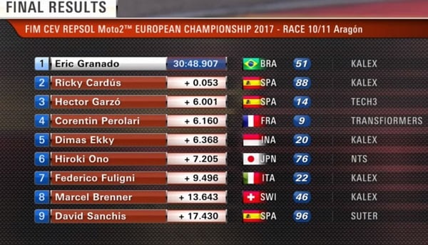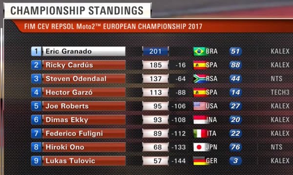Après la première course qui s’était déroulée en fin de matinée ce dimanche, au classement provisoire du Championnat d’Europe Moto2, Eric Granado était en tête avec 176 points, devant Ricky Cardus (165), Steven Odendaal (137), Hector Garzo (97) et Joe Roberts (95).
