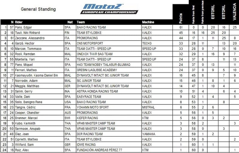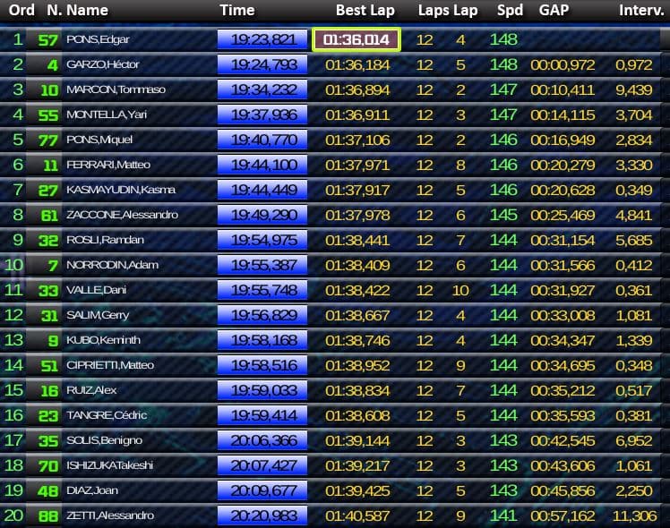 Finalement, sur la ligne d’arrivée Edgar Pons remportait une belle victoire avec 0,972 d’avance sur Héctor Garzó. Tommaso Marcon terminait à la troisième place devant son équipier Yari Montella, Miquel Pons et Matteo Ferrari. Cédric Tangre terminait seizième et Philippe Le Gallo vingt-huitième.