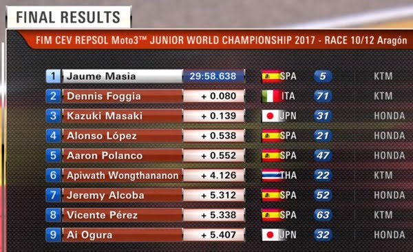Résultats de la course Moto3 (avant l’application de la pénalité de Lopez) :