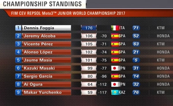 Lopez passait en tête dans le dernier tour, devant Masia, Foggia, Polanco et Masaki. Masia plongeait au commandement et l’emportait devant Foggia, Masaki (Lopez pénalisé) et Polanco. Denni Foggia été sacré Champion du Monde Junior 2017