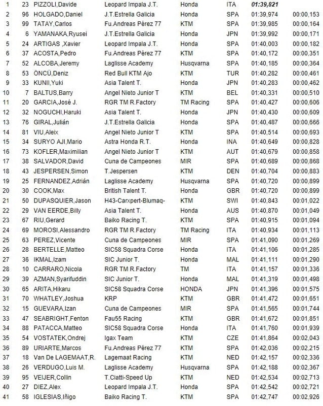 L’après-midi, Carlos Tatay (Fundación Andreas Pérez 77) réalisait le meilleur temps en 1’40.018, soit moins vite que le matin. Il précédait Jeremy Alcoba (Laglisse Academy), Davide Pizzoli (Leopard Impala Junior Team) et Daniel Hidalgo (Junior Team Estrella Galicia).