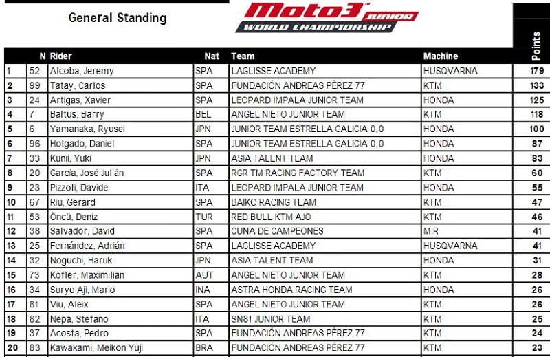 Avec 46 points d’avance au classement provisoire du Championnat sur le seul autre prétendant Carlos Tatay (Fundación Andreas Pérez 77), Jeremy Alcoba (Laglisse Academy) le leader n’était pas vraiment inquiet et seule une malchance incroyable pourrait le priver du titre ce weekend. Alcoba avait signé deux de ses cinq podiums acquis en 2018 à Valence et il connaissait bien le Circuit Ricardo Tormo. Aucun pilote français ne participait à cette épreuve en catégorie Moto3.