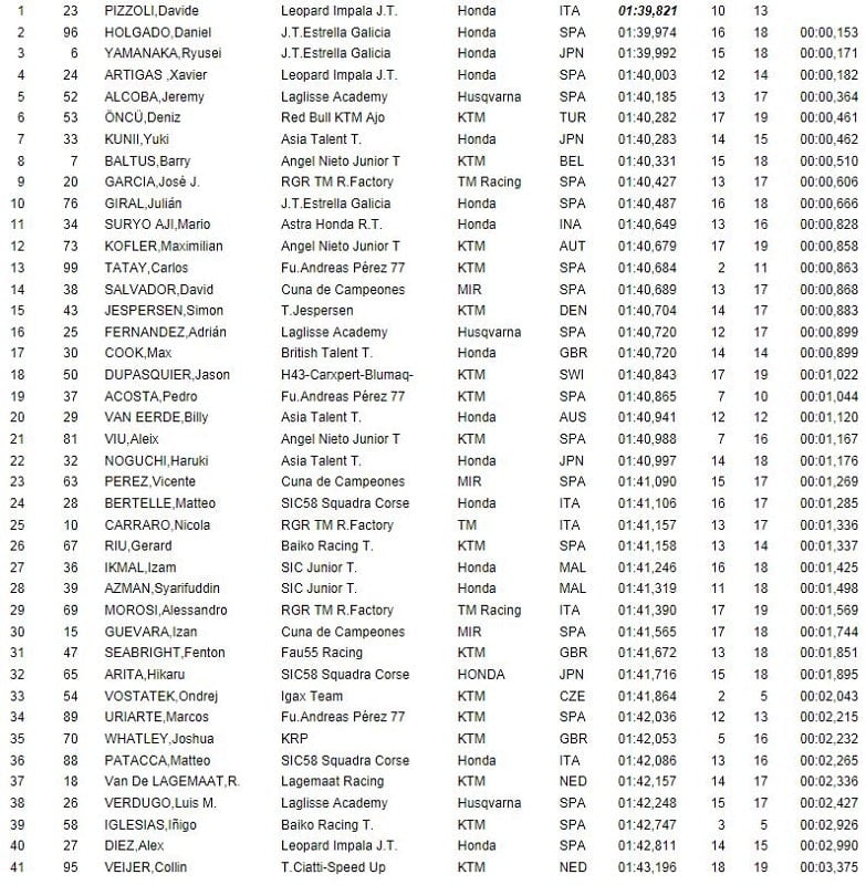 L’après-midi, Carlos Tatay (Fundación Andreas Pérez 77) réalisait le meilleur temps en 1’40.018, soit moins vite que le matin. Il précédait Jeremy Alcoba (Laglisse Academy), Davide Pizzoli (Leopard Impala Junior Team) et Daniel Hidalgo (Junior Team Estrella Galicia).