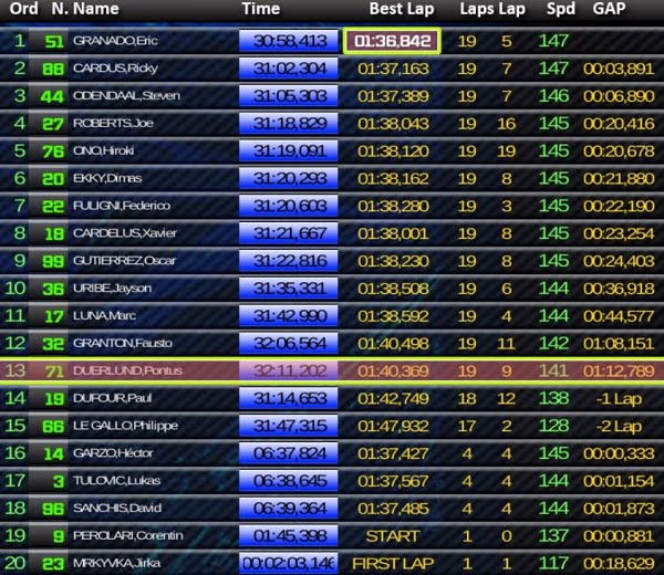 Hector Garzo, alors en deuxième position, chutait sans gravité, bientôt imité par David Sanchis et Lukas Tulovic. Granado possédait alors 2.3 d’avance sur Odendaal et Cardus. Granado améliorait le meilleur tour en 1’36.842. Federico Fuligni, quatrième, était à 8 secondes du leader.