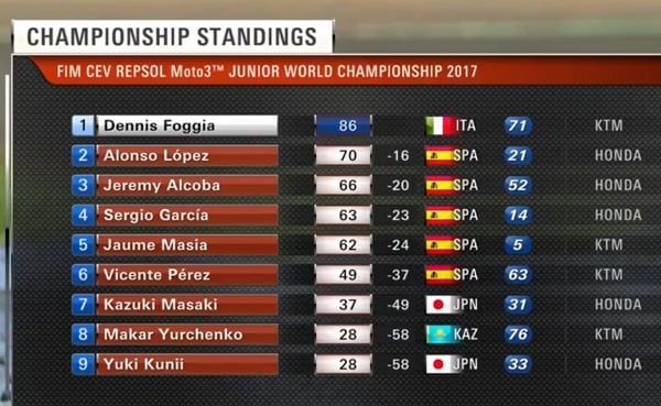 C’est avec une énorme avance de 3.8 que le protégé de Valentino Rossi a réussi à s’imposer devant Alonso Lopez, Jeremy Alcoba, Vicente Perez et Kazuki Masaki. C’était, et de loin, le plus grand écart entre le vainqueur et le deuxième en CEV cette année en Moto3.