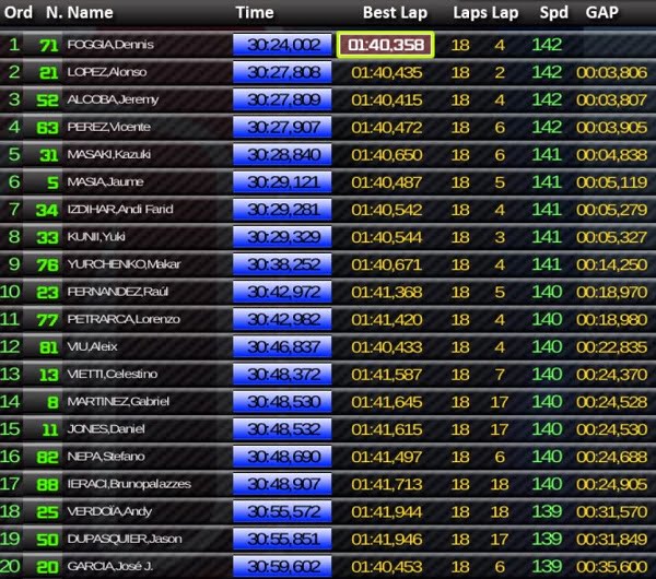 Foggia creusait un écart de 1.4 sur Viu, Perez, Lopez, Alcoba, Garcia et Masaki. Il accroissait son avance à 2.5 devant un groupe de 11 pilotes emmené par Alcoba, Lopez, Perez, Viu, Garcia et Masaki. Foggia réalisait le meilleur tour en 1’40.358.