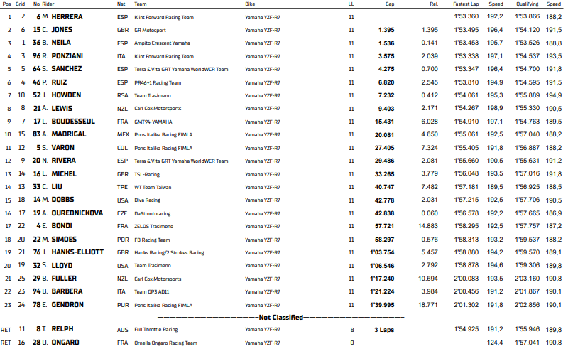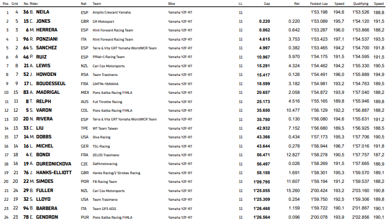 À l’entame du cinquième tour, Neila et Jones ont profité de l’aspiration pour doubler Herrera. Les positions n’ont alors plus bougé jusqu’à la ligne d’arrivée. Neila s’est offert à son tour sa victoire du week-end, tandis que Jones a terminé deuxième pour la seconde fois. Herrera a dû se contenter de la troisième place, devant Ponziani, Sánchez et Ruiz. Lucie Boudesseul a décroché une nouvelle neuvième place et Emily Bondi a de nouveau terminé 17e.