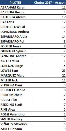Bien sûr, pire que Honda, il y a, avec Aprilia qui a subi 39 chutes pour 2 pilotes, soit 139% de chances de chuter durant le week-end. Et cela ne tient pas seulement à Sam Lowes, puisque Aleix Espargaro totalise déjà 14 unités, soit autant de chutes que de Grand Prix.