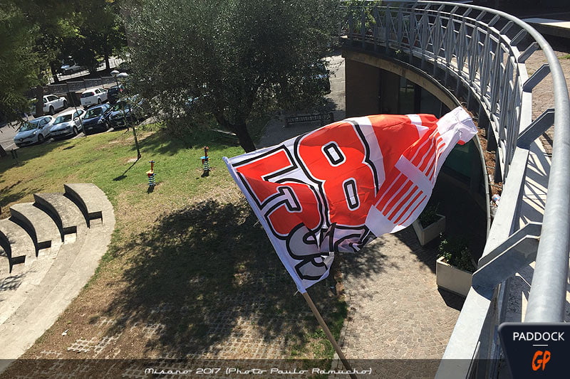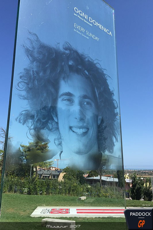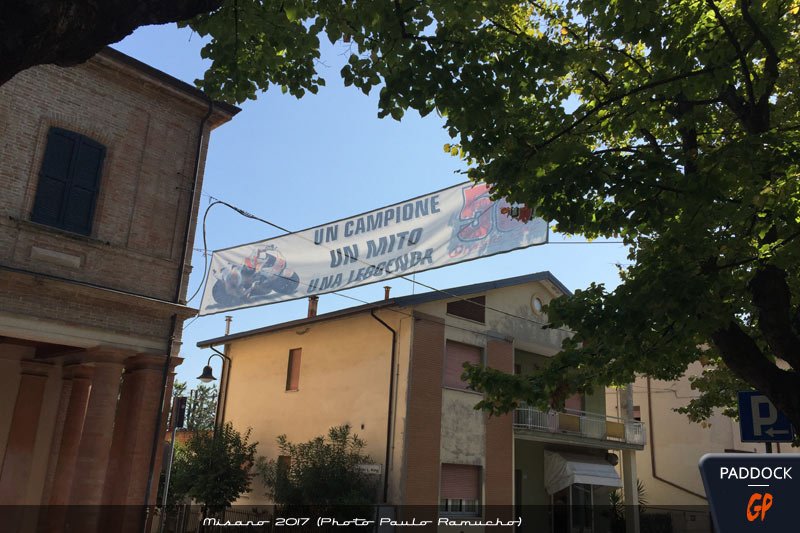 Située plus près du circuit et de sa stèle que Tavullia, la ville affiche clairement les couleurs de son champion trop tôt disparu, sous l’impulsion de son père Paolo.