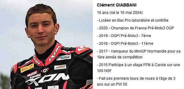Pour sa troisième année d’activité, l’Équipe de France de Vitesse a recruté dans ses rangs Clément Giabbani, 16 ans, Champion de France Objectif Grand Prix Pré-Moto3 2020. La catégorie Objectif Grand Prix Pré-Moto3, qui se déroule dans le cadre du Championnat de France FSBK, est une étape clé pour les jeunes talents dans le parcours vers le haut niveau que la FFM a mis au coeur de la refonte de sa filière vitesse.