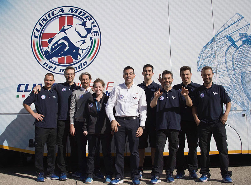 « En 2017, nous avons aidé tous les pilotes des 2 championnats. Entre les nécessités de physiothérapie, les problèmes médicaux et les traumatismes/blessures, au cours d’une saison, nous voyons tous les pilotes. En particulier, en MotoGP, nous disposons de statistiques : en 2017, nous avons effectué environ 1000 services médicaux et 5900 services de kinésithérapie pour les pilotes (sans compter les statistiques d’activité pour les membres de paddock, ce qui est tout aussi exigeant, vu que la communauté des paddocks est comme un petit village itinérant). »