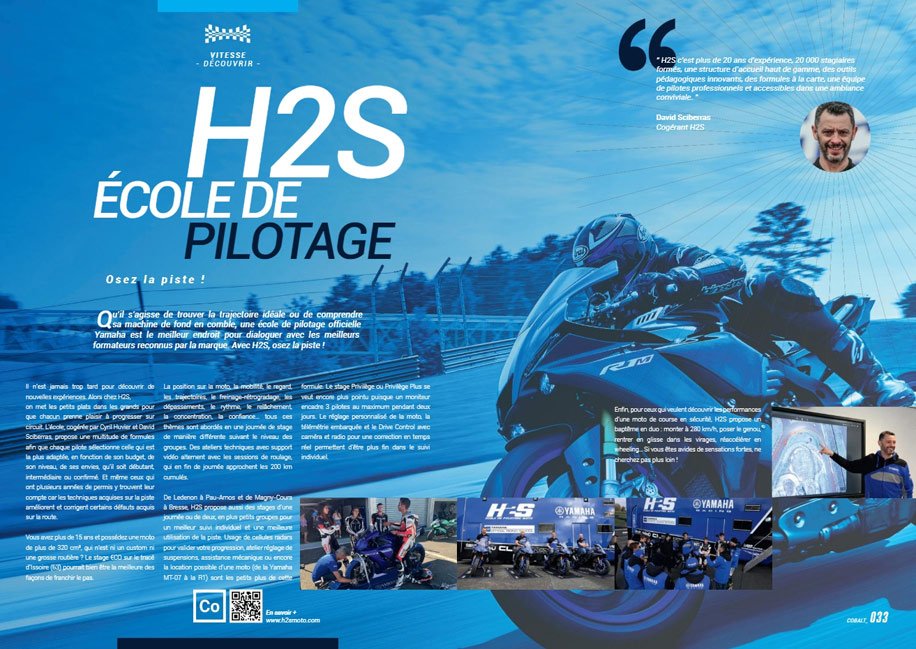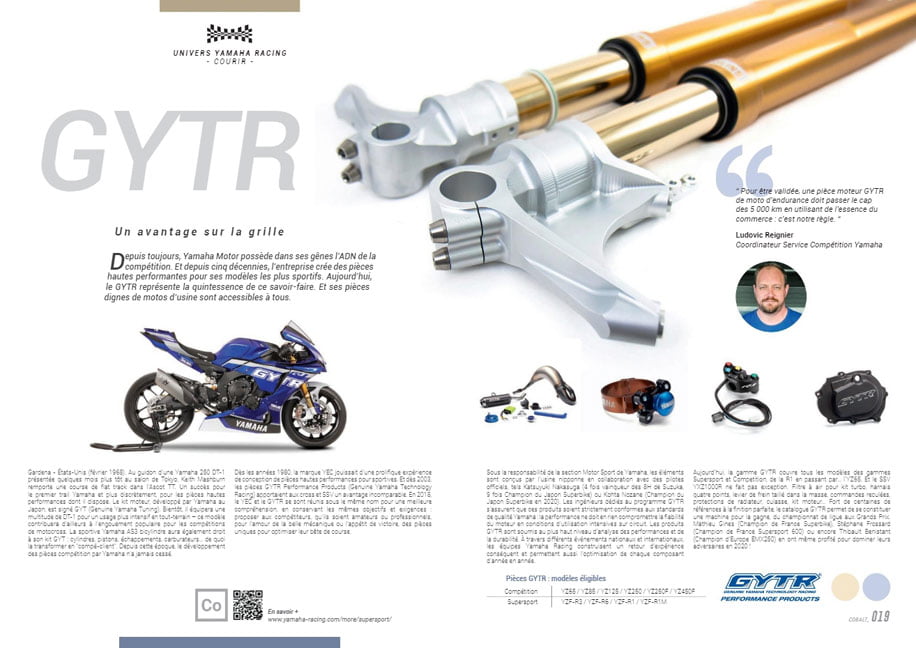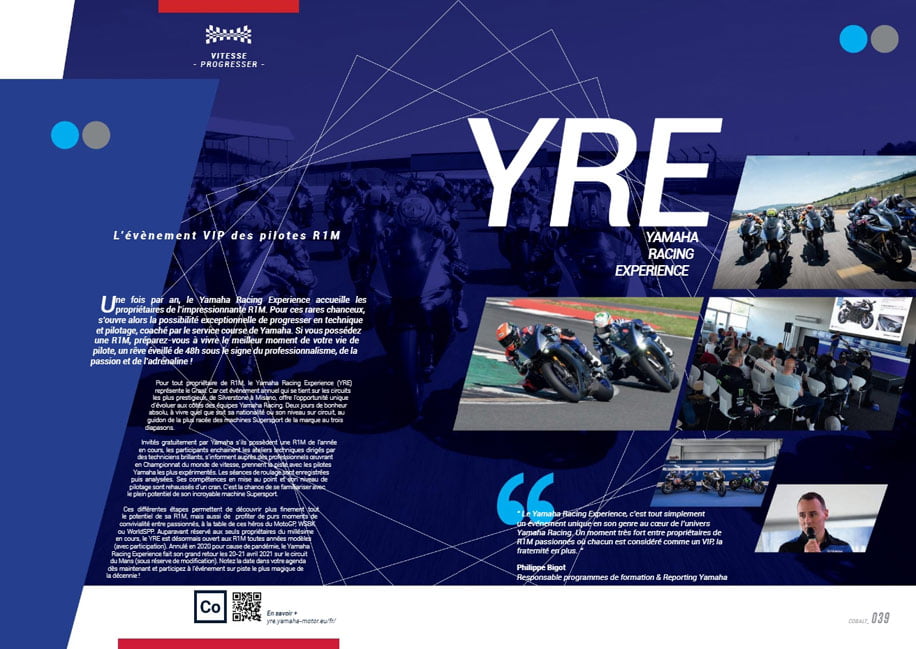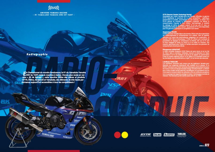 Dans ce premier numéro de 88 pages, au papier et à l’impression de qualité, tout lecteur de COBALT trouvera nombre d’articles inspirants. bLU CRU, écoles de pilotage, Supersport Pro Tour, Challenge R3, Yamaha Racing Experience, Yamaha Track Days, YXZ1000R Ice Cup, gammes vestimentaires et d’accessoires, Yamalube et GYTR… l’intégralité de l’univers RACE de Yamaha est clairement présenté, qu’on soit attiré par des activités loisir ou compétition.