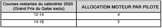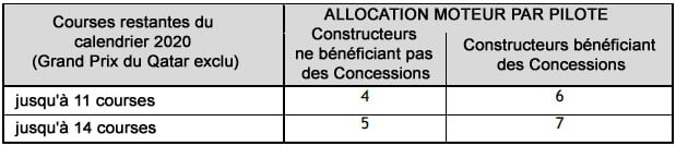 1. Si le nombre total d’épreuves en 2020 est inférieur à 12 (y compris le Qatar), l’ensemble de 2020 et 2021 sera considéré comme une seule saison et l’allocation moteur maximale combinée pour les deux saisons sera de 9 moteurs.