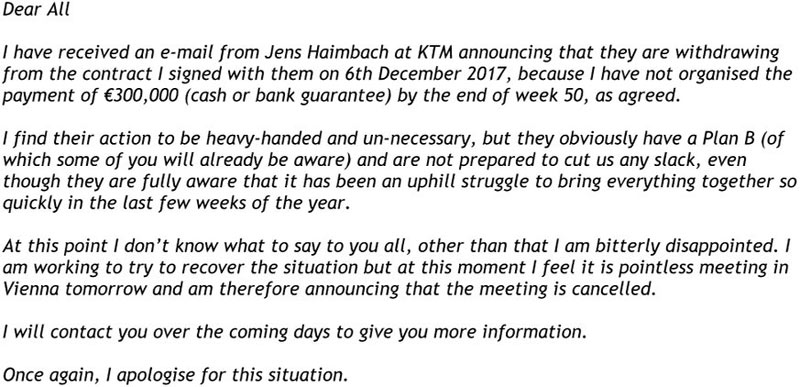 Selon le message de l’intéressé lui-même, KTM aurait même rompu le contrat le liant avec le banquier d’investissement, car les paiements convenus de plus de 300 000 euros n’ont pas été effectués à la fin de la semaine dernière (voir texte de David Pickworth ci-dessous). Que cela soit dû à Pickworth lui-même ou à ses très mystérieux investisseurs russes en arrière-plan (voir ici), on est encore sans réponse. Le Britannique, qui vit à Vienne, espère que la situation sera miraculeusement clarifiée avant Noël mais ne veut pas faire d’autre commentaire pour le moment.
