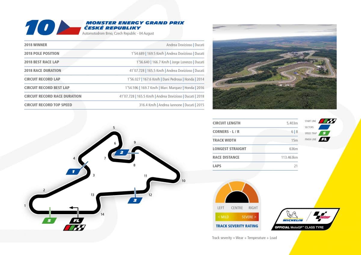 Après une pause dans le calendrier MotoGP, le championnat reprend avec deux courses d’affilée puisque l’Autriche attend les acteurs du MotoGP immédiatement après Brno. Mais avant de se rendre sur le Red Bull Ring, Michelin et les pilotes vont affronter les 5,403 km du Masaryk Circuit pour la 10e manche de la saison. Construite dans les forêts entourant Brno, la piste offre beaucoup de dénivelés, des zones de freinages violents, des courbes rapides et des fortes accélérations qui poussent les pneumatiques, les pilotes et les motos aux limites. La gamme des pneus MICHELIN Power Slick proposée est parfaitement adaptée à ces contraintes. Les slicks avant soft, medium et hard sont symétriques, alors que les slicks arrière sont asymétriques avec un côté droit plus dur en raison des huit virages dans cette direction contre six à gauche.