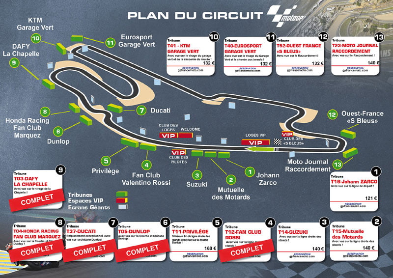 Huit tribunes restent encore disponibles mais certaines d’entre elles, comme la tribune Johann ZARCO ou la tribune Moto Journal / Raccordement, sont proches d’être également complètes alors rendez-vous dès maintenant sur gpfrancemoto.com pour réserver vos places.