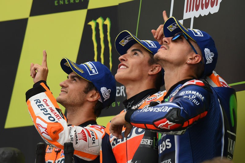 Tous les pilotes étant partis en pneus pluie et ayant dû passer au stand pour changer de motos, la course a mis longtemps à se décanter. Dani Pedrosa (Repsol Honda Team) est lui aussi remonté dans le peloton – il avait rejoint la piste en 8e position – pour prendre la 2e place. L’attaque de Maverick Viñales (Movistar Yamaha MotoGP) a été récompensée par une 3e place. L’Espagnol était 13e après son pit-stop. Il a signé le meilleur tour en course au 17e tour, sous les yeux des 87 541 fans présents autour du circuit. Valentino Rossi (Movistar Yamaha MotoGP) fut l’un des derniers à changer de moto. Grâce à d’impressionnantes manœuvres de dépassement, il s’est hissé de la 14e à la 4e place finale.