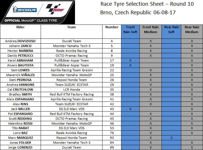 Après les changements de motos autorisés par le règlement « flag-to-flag », les pneus Michelin slicks les plus utilisés furent le medium à l’avant et à l’arrière. Certains avaient opté pour du soft à l’avant et à l’arrière, alors que d’autres avaient misé sur du medium à l’avant et soft à l’arrière. Tous les compétiteurs, teams et constructeurs disposent en effet de nombreux choix de pneumatiques.