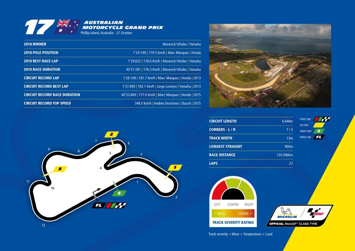 Phillip Island et son ruban d’asphalte de 4,448 km perché en haut des falaises surplombant le détroit de Bass – un bras de mer qui sépare la Tasmanie et l’état de Victoria, sur le continent australien – est l’un des circuits les plus exigeants du calendrier MotoGP. Les sept virages à gauche et cinq à droite négociés dans le sens anti-horaire sont très éprouvants pour les gommes à cause des températures élevées engendrées par l’abrasivité de la piste. Une mise en régime rapide est également demandée car à cette époque de l’année, l’air frais peut très vite refroidir les gommes. A cause de toutes ces contraintes, la gamme de pneus MICHELIN Power Slicks a été spécialement conçue pour ce circuit. Les pneus dits « Phillip Island » répondent aux attentes des pilotes et de leurs machines pour leur permettre de pousser jusqu’aux limites en totale confiance. Ils sont disponibles en soft, medium et hard pour l’avant et l’arrière. C’est l’une des trois fois de la saison que toute l’allocation de pneumatiques est asymétrique – avec le Sachsenring et Valence – avec un côté gauche plus dur pour supporter les charges extrêmes qui s’appliquent de ce côté-là du pneu.