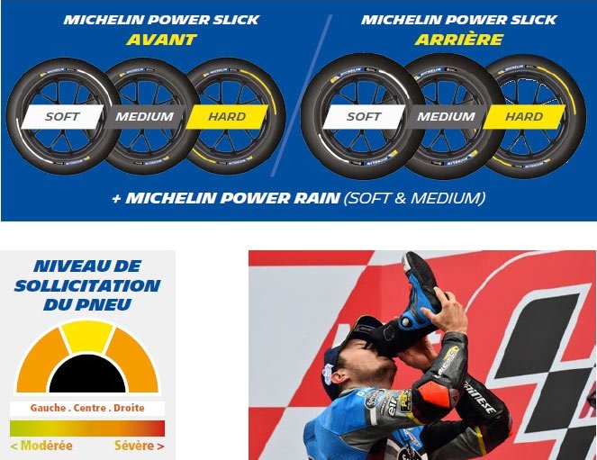 En revanche, les pneus arrière sont asymétriques pour supporter les contraintes, avec un côté droit doté d’une gomme plus dure pour offrir une meilleure longévité et un grip optimum sur les courbes à droite plus nombreuses. Le côté gauche dispose d’un mélange plus soft pour favoriser la mise en régime et garder une température de fonctionnement optimale pendant que la moto est sur l’angle à droite. Les pneus arrière sont proposés en soft (bande blanche), medium (sans bande) et hard (bande jaune) avec des gommes adaptées à l’abrasivité moyenne de la piste. L’an passé, ce fut la course la plus pluvieuse de la saison MotoGP, et même si personne n’a envie d’être trempé à nouveau, Michelin a prévu une gamme de MICHELIN Power Rain en soft et medium.