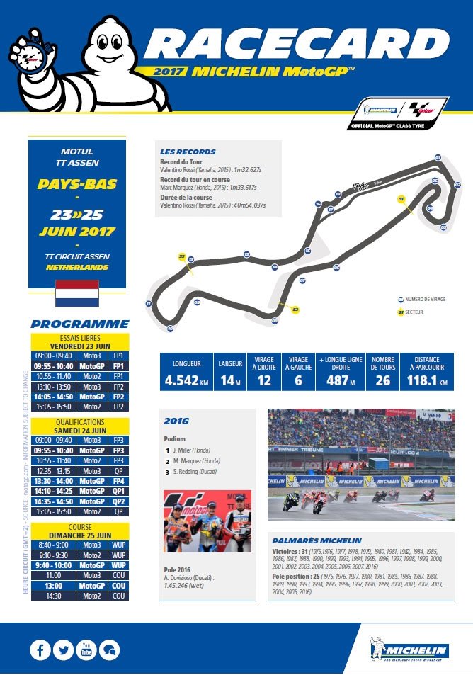 Michelin et le Championnat du monde MotoGPTM 2017 sont en route pour l’épreuve la plus septentrionale de l’année, le Motul TT Assen, aux Pays-Bas, 8e manche de la saison.