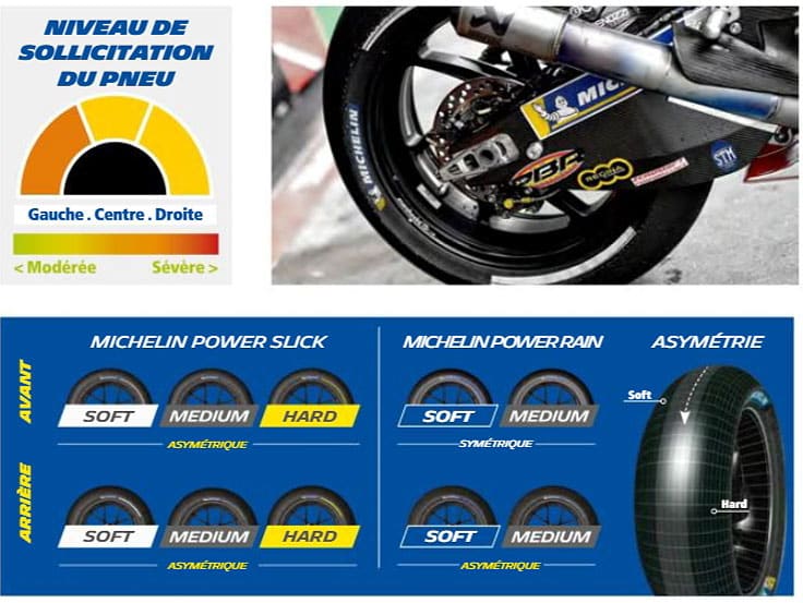 Avec seulement 4,005 km de long, le circuit de Valence est l’un des plus courts de la saison – derrière le Sachsenring – mais c’est une piste qui demande une préparation toute particulière car elle est très technique et étroite. Le sens anti-horaire, les neuf virages à gauche et cinq à droite confinés dans un stadium, imposent à Michelin de proposer une gamme de pneus MICHELIN Power Slicks asymétriques adaptés aux incessants changements de direction et au temps passé sur l’angle. Les pneus avant et arrière soft, medium et hard sont tous asymétriques, et ce pour la troisième fois de la saison. Ils sont dotés d’un côté gauche plus dur pour faire face au plus grand nombre de virages et de courbes rapides dans cette direction. La dernière manche de la saison est plus tardive cette année et, avec l’Europe plongée en hiver, les températures peuvent être plus fraîches. Les gommes proposées par Michelin ont donc une mise en régime rapide. Les risques de pluie étant bien réels, les MICHELIN Power Rain sont disponibles en soft et medium pour l’avant et l’arrière. Ces derniers sont asymétriques pour offrir un grip maximum sur une piste mouillée.