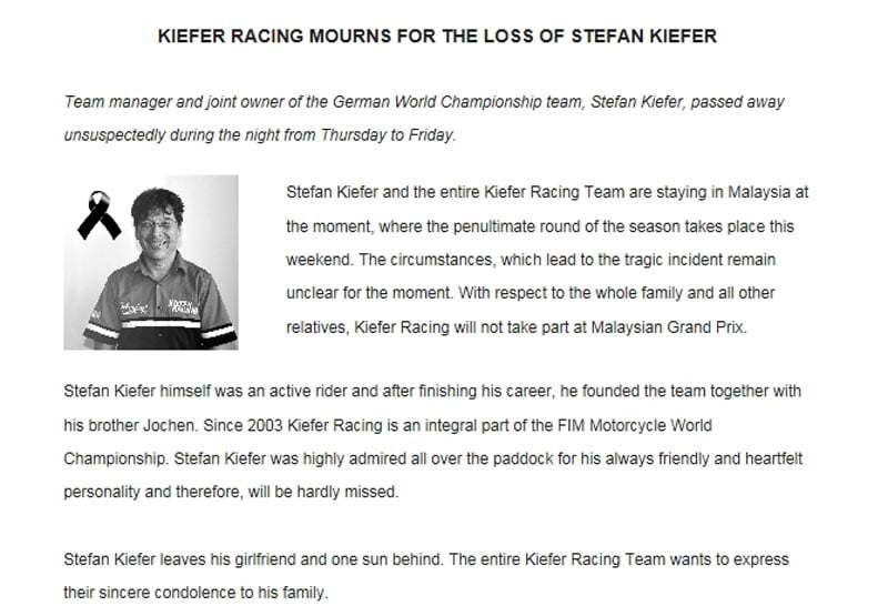 Stefan Kiefer lui-même était un pilote actif et, après la fin de sa carrière, il a fondé l’équipe conjointement avec son frère Jochen. Depuis 2003, Kiefer Racing est une partie intégrante du Championnat du monde de Moto FIM. On a fortement admiré Stefan Kiefer, partout dans le paddock, pour sa personnalité toujours amicale et cordiale, et il sera donc fortement regretté.