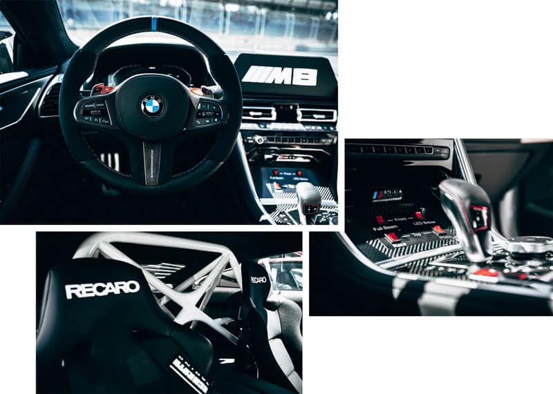Afin d’achever la transformation de la BMW M8 Compétition en MotoGP™ Safety Car, des fonctions spéciales racing et de sécurité ont également été installées. Il s’agit notamment d’un capot avec ‘motorsport lock’, de volets en carbone personnalisés et de l’aileron arrière de la BMW M8 GTE.