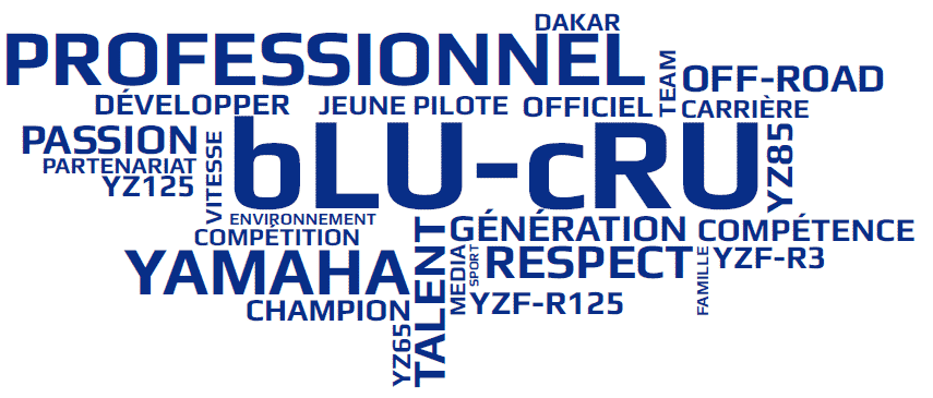 Le programme bLU cRU a pour objectif de soutenir la prochaine génération de jeunes pilotes en vitesse et tout-terrain. Le programme crée un environnement professionnel qui est utilisé pour développer les compétences des futurs champions de la compétition moto grâce aux conseils et à l’expérience de Yamaha Racing. Le bLU cRU est le fondement de la pyramide de la compétition chez Yamaha. Le bLU cRU est également représenté au sommet de chaque discipline en compétition. Les pilotes officiels de Yamaha Racing en MXGP, Enduro, Rallye-Raid, WorldSBK, WorldSSP et WEC ont la responsabilité d’être ambassadeurs. Ils sont un exemple pour la jeune génération en soulignant les valeurs clés pour la compétition et la représentation des marques. Entraînement physique, performance, politesse, engagement, respect. Leur attitude devant les médias et les fans sont la norme pour la génération bLU cRU de demain.