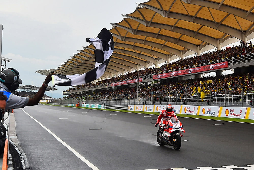 Parti de la pole position, Dovizioso perdait rapidement son avantage lorsque Jorge Lorenzo (Movistar Yamaha MotoGP) entrait en tête dans le premier virage. Au terme de la première boucle complétée sur une piste détrempée, Valentino Rossi (Movistar Yamaha MotoGP) pointait en première position d’un peloton encore très regroupé. Sur le tracé de Sepang, long de 5,543 km, les conditions étaient pour le moins compliquées, après des pluies torrentielles tombées lorsque les pilotes prenaient leur place sur la grille. Le départ était retardé et la distance de course était réduite à 19 tours. La majorité des pilotes avaient choisi les pneus MICHELIN Power Rain medium à l’avant, comme à l’arrière. Tandis que les concurrents trouvaient une adhérence optimale sur les flaques d’eau durant les premiers tours, le nom du leader changeait à plusieurs reprises avec, en tenant compte des conditions, quelques impressionnantes manœuvres de dépassements. Dovizioso occupait la troisième place avant de prendre l’avantage sur son équipier Andrea Iannone (Ducati Team) au douzième tour. L’Italien se lançait ensuite à la poursuite de son compatriote Rossi. Il saisissait l’opportunité de passer lors de la quinzième boucle pour s’installer en tête et creuser l’écart. Dovizioso ne se retournait plus pour aller s’imposer avec plus de trois secondes d’avance, tandis que Rossi s’adjugeait la deuxième position. C’est la seconde victoire en MotoGP dans la carrière de Dovizioso. Il devient ainsi le neuvième vainqueur différent dans la discipline en une seule saison, un record.