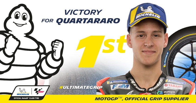Quartararo était en super forme tout le week-end, battant le record du tour samedi matin avant de l’améliorer une nouvelle fois en qualification avec un 1min36s705 synonyme de pole position. Ce tour a été bouclé avec un slick hard avant et un soft arrière, une association choisie par la plupart des pilotes pour la course longue de 25 tours, dont Quartararo lui-même qui a ainsi pu démontrer que ses pneumatiques ultra rapides sur un tour ont aussi fait preuve de consistance et de performance tout au long de cette course très intense. Le Français a pris un bon départ mais a dû s’incliner face à Maverick Viñales (Monster Energy Yamaha MotoGP) au premier virage avant que le Champion du monde en titre Marc Márquez (Repsol Honda Team) s’empare des rênes. Márquez a commencé à s’échapper, mais une erreur l’a conduit dans le bac à gravier, d’où il est ressorti en dernière position. Il a ensuite effectué une remontée incroyable grâce au grip de ses MICHELIN Power Slicks pour revenir dans la bagarre pour la deuxième place, avant de chuter lourdement et de perdre tout espoir de marquer des points. Quartararo a repris la première place au neuvième tour et a contrôlé ses adversaires jusqu’au drapeau à damier, pilotant en totale harmonie avec ses pneumatiques pour s’imposer avec 4.603 secondes d’avance. Le Français de 21 ans était à peine né quand son compatriote Régis Laconi remportait son premier Grand Prix en catégorie-reine, à Valence en 1999, sur une Yamaha équipée de pneus Michelin.