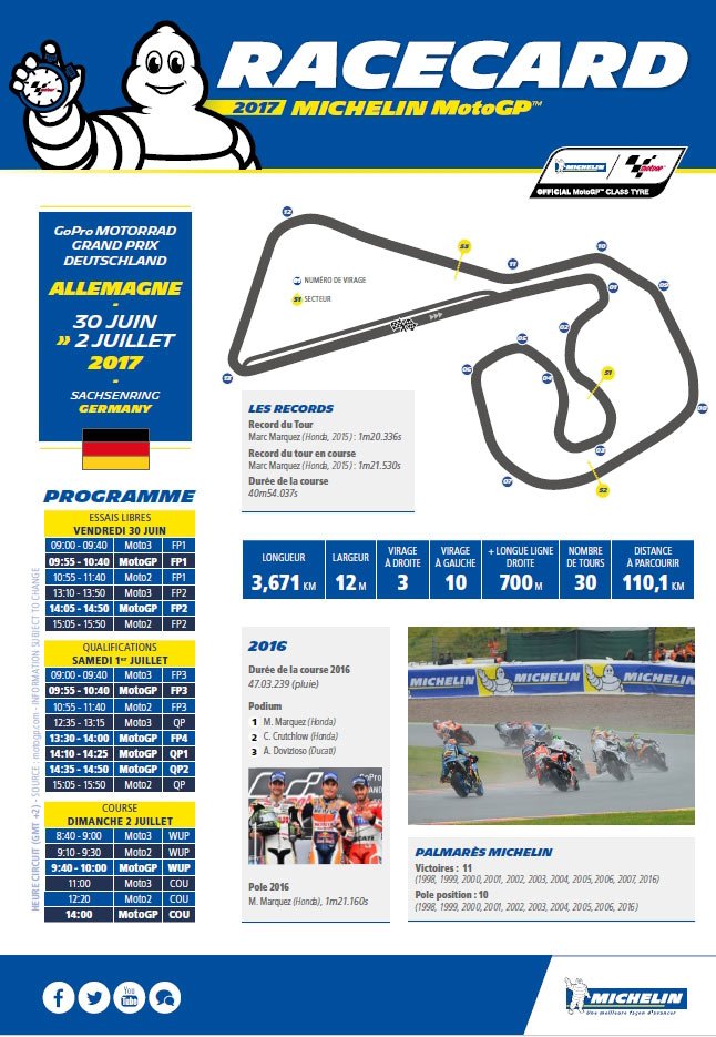 Michelin est en partance pour le Sachsenring en Allemagne et le GoPro Motorrad Grand Prix Deutschland qui marque la mi-saison MotoGP™ 2017 ainsi qu’un nouveau challenge pour le manufacturier de pneumatiques français.