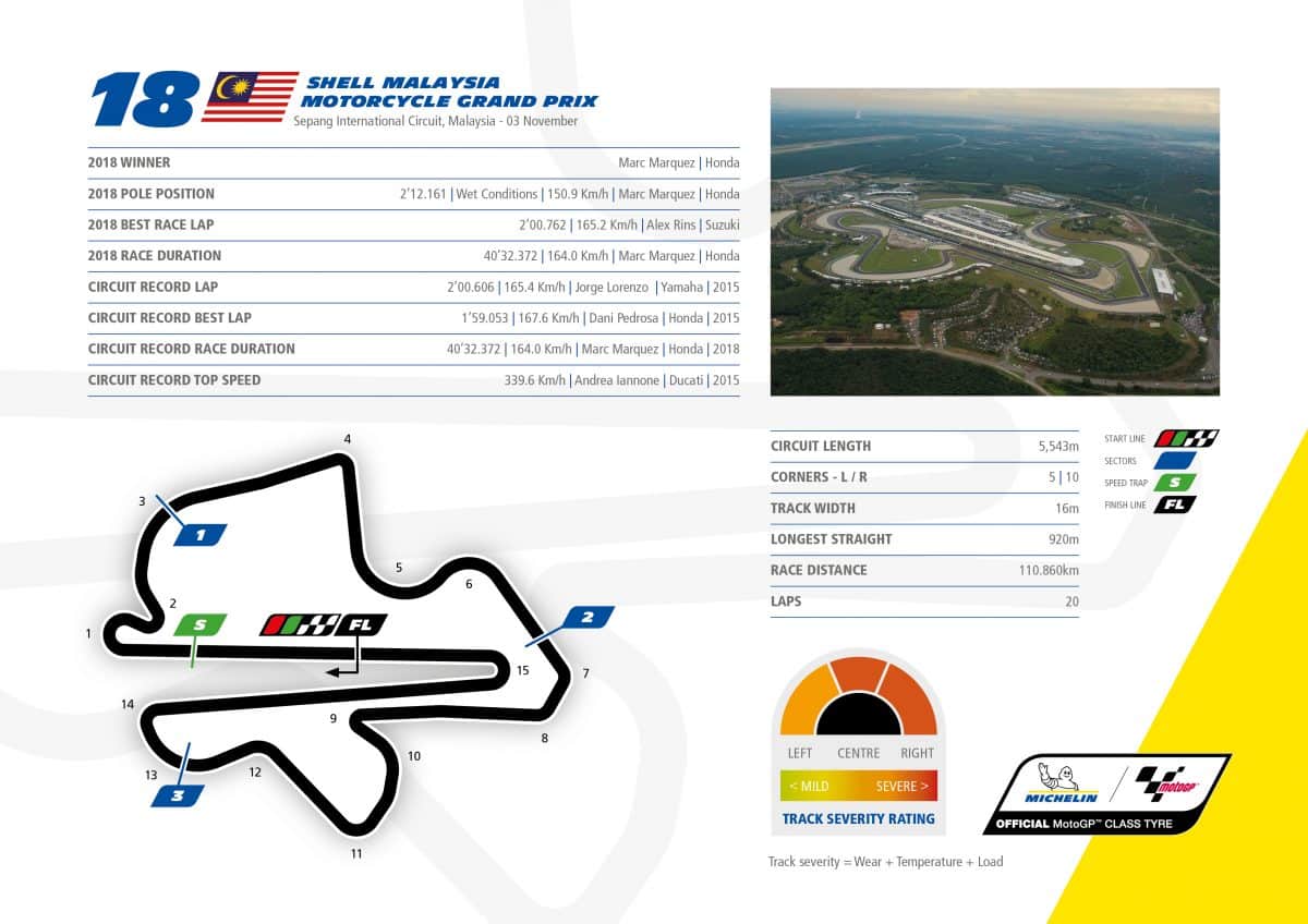 La Malaisie marque la fin d’une période de cinq semaines très chargée pour le paddock du MotoGP avec des courses en Thaïlande, Japon, Australie et donc cette épreuve à Sepang. Après une météo variable rencontrée au cours de ces derniers meetings, Michelin est prêt à toute éventualité et le circuit malais va sans doute concentrer différentes conditions. Sepang demande à la fois de la performance technique et météorologique. Le tracé long de 5,543 km compte cinq virages à gauche et dix à droite, combinés avec deux longues lignes droites, du dénivelé et une surface abrasive où le thermomètre dépasse régulièrement les 50°C. Ce circuit technique, ainsi que les hautes températures et l’humidité, sont éprouvants pour les pilotes, les motos et surtout les pneus Michelin.