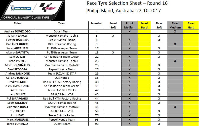 La météo fut instable tout le week-end à Phillip Island avec des sessions sous des températures fraîches, des essais sur une piste mouillée et séchante. Les pilotes ont donc attendu le tout dernier moment pour juger les conditions et effectuer leurs choix de pneus MICHELIN Power Slicks. La course s’est élancée sous une météo ensoleillée et très venteuse, et sous des températures les plus élevées du week-end. Marquez a pris l’option d’un medium à l’avant et d’un soft à l’arrière, des pneus qu’il a parfaitement su gérer pour remporter sa 6e victoire de la saison et augmenter son avance au championnat. Rossi, 2e à l’arrivée, était équipé de medium à l’avant et à l’arrière, alors que Viñales, 3e, était en medium à l’avant et soft à l’arrière. Zarco a pris la 4e place finale – et a signé le meilleur tour en course – ce qui renforce sa place de leader au classement du First Independent Rider et lui offre le titre de Rookie of the Year. Crutchlow a fini à la 5e place, de très peu devant Iannone. Jack Miller a pris la 7e place devant Rins et le top-ten est complété par les pilotes Red Bull KTM Factory Racing Team Pol Espargaro et Bradley Smith.
