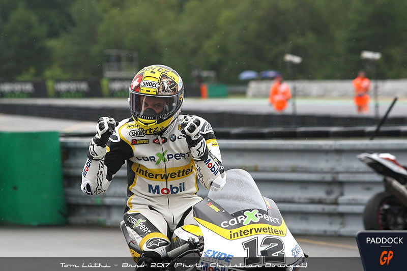 A Brno (République Tchèque), dans une course qui s’est déroulée sur six tours après une première interruption due à l’arrivée de la pluie, le pilote suisse a été impressionnant en réussissant un départ parfait depuis la troisième ligne – Tom était septième de la première course au moment de l’arrêt -, prenant tous les risques sur l’extérieur de la trajectoire avant de plonger en tête dans le premier virage. Personne n’allait plus le revoir, Lüthi évoluant nettement au-dessus du lot dans ces conditions d’adhérence précaires. Il n’allait cesser d’augmenter son avantage, avant de contrôler parfaitement la deuxième partie de ce sprint qui lui a permis, en une seule course, de diminuer de moitié son retard au classement intermédiaire du championnat du monde Moto2 (désormais 17 points par rapport à l’Italien Franco Morbidelli, huitième de ce GP de la République Tchèque).