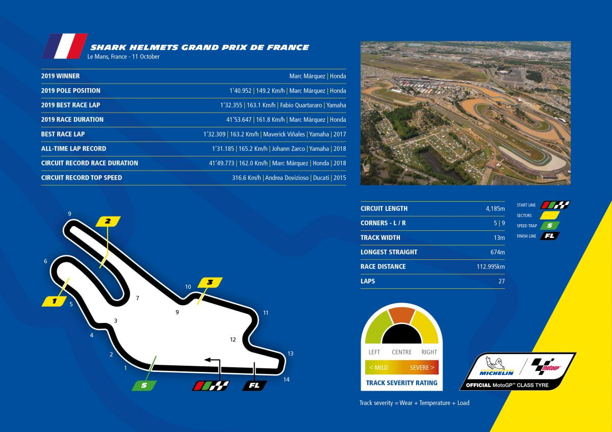 Le Mans fait partie de l’histoire de Michelin en compétition, tant sur deux-roues que sur quatre-roues. C’est un circuit mythique sur lequel Michelin a battu de nombreux records en MotoGP. La piste longue de 4,185 km avec cinq gauches et neuf droites est très étroite avec plusieurs virages lents qui demandent beaucoup de stabilité du pneu avant. La gomme des MICHELIN Power Slicks répond à cette demande notamment lors des forts freinages, tandis que la nouvelle construction 2020 du pneu arrière apporte de la performance en accélération permettant de réaliser des tours rapides.