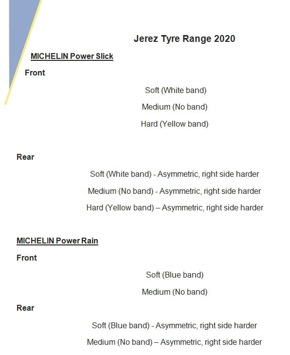 Les courses de Jerez représentent d’entrée un challenge de taille pour le nouveau MICHELIN Power Slick arrière, car les températures seront considérablement plus élevées que celles du mois de mai, période durant laquelle ce Grand Prix aurait dû se dérouler. Cependant, durant la pause, les techniciens de Michelin Motorsport ont travaillé sur les données historiques de ce tracé de 4,423 km, partiellement resurfacé ces dernières années et, à l’aide de la simulation informatique, ils ont pu sélectionner les combinaisons optimales gommes/construction. Trois types de pneus avant et arrière MICHELIN Power Slick seront disponibles pour les deux courses : un soft, un medium et un hard. Les avants se caractérisent par un design symétrique, tandis que les arrières sont asymétriques avec un côté droit plus dur pour négocier les huit virages à droite qui sollicitent davantage les pneus que les cinq à gauche. Le risque de pluie est moindre qu’au mois de mai, mais les MICHELIN Power Rain figurent tout de même au paquetage avec un soft et un medium pour l’avant et l’arrière. Là aussi, les arrières sont asymétriques avec un côté droit plus dur, tandis que les avants sont symétriques.