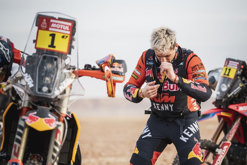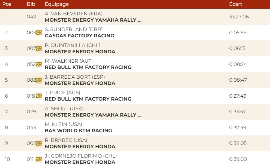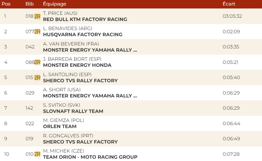 Pour Price, cette dixième étape sonne donc comme une revanche après sa sanction lors de la cinquième spéciale, lorsque le vainqueur des éditions 2016 et 2019 avait été pénalisé pour un excès de vitesse, devant céder la victoire à Danilo Petrucci (qui a pour sa part terminé cette dixième étape à une très honorable 11e place). Le pilote KTM devance ainsi à l’arrivée Luciano Benavides (frère cadet de Kevin), à 2’09, et donc Van Beveren à 3’35.