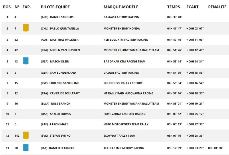 Le classement général est toujours dominé par l’Australien Daniel Sanders (GasGas) devant Pablo Quintanilla (Honda), Matthias Walkner (KTM) et le Français Adrien Van Beveren (Yamaha).